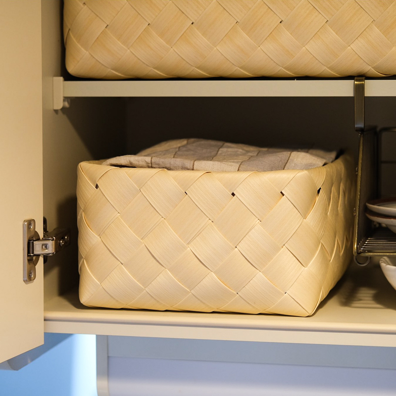 オープンラックが備わっているため、そこに Timb.を複数使って収納しています。同じ種類のカゴを繰り返し使うだけで統一感がでて、まとまりのある素敵な空間に仕上がります。