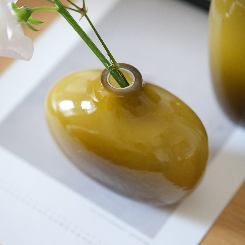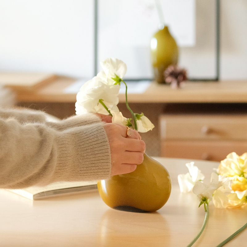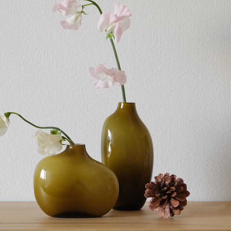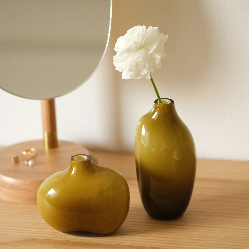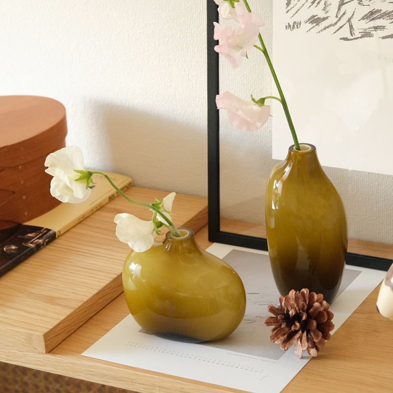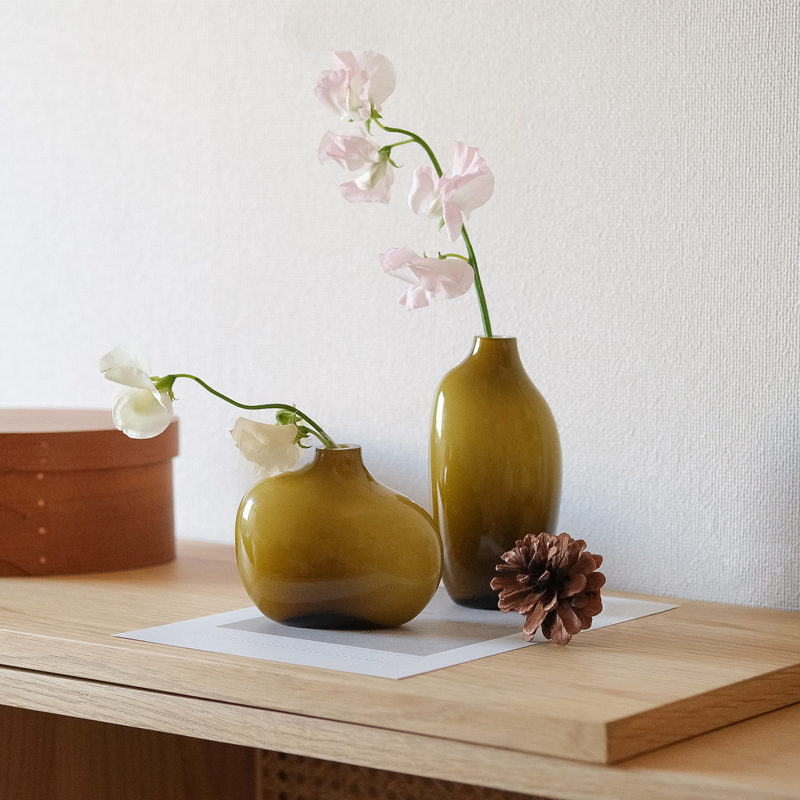 フラワーベース自体の色味や形に存在感があるため、一輪でも物足りなさを感じることなく、素敵に飾れます。