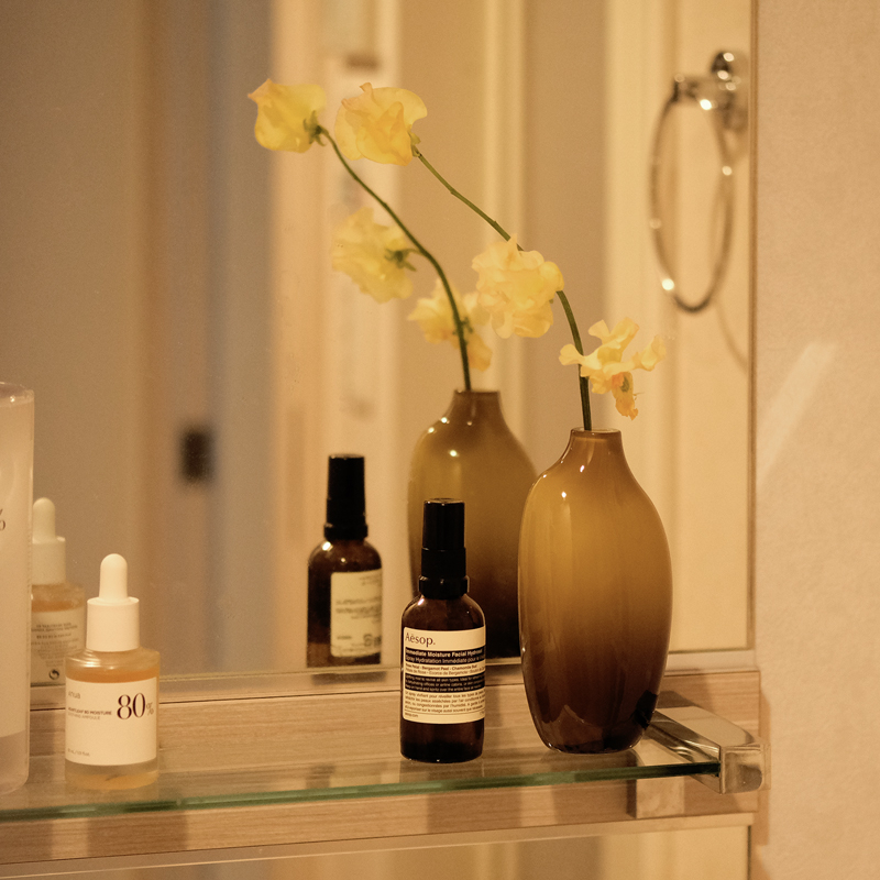 飾るお花によって、シェルフやダイニング、洗面所などに移動させながら使っています。